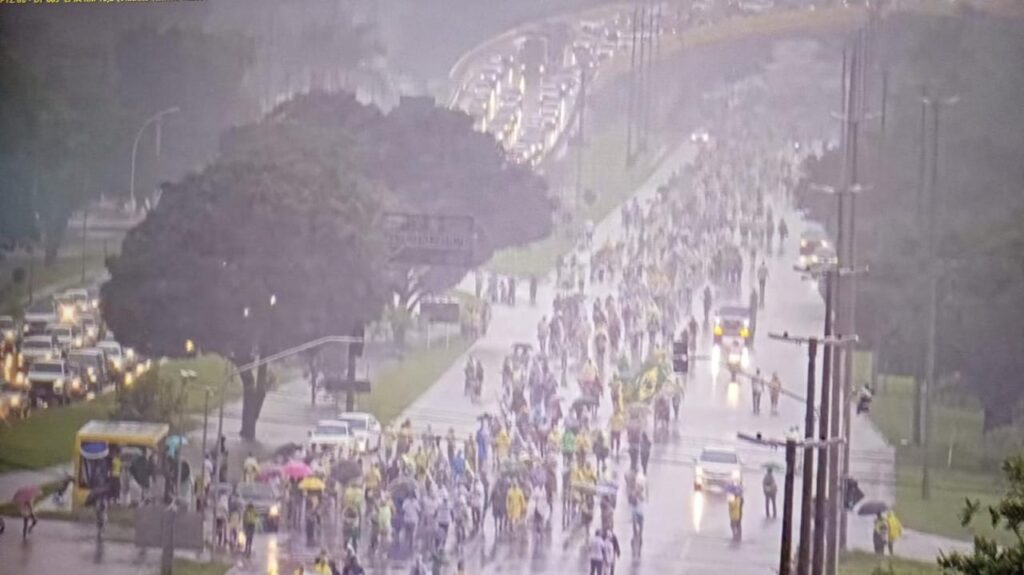 O momento foi registrado em vídeo e passou a circular rapidamente nas redes sociais. A descarga elétrica aconteceu em meio a chuva forte e ventos intensos, justamente quando apoiadores do deputado federal Nikolas Ferreira (PL-MG) aguardavam o fim oficial da chamada ‘Caminhada pela Liberdade’, mobilização iniciada em Paracatu (MG) e que percorreu cerca de 240 quilômetros até a capital federal.