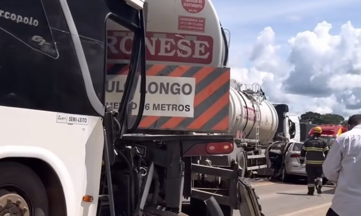 Um grave acidente foi registrado na tarde deste domingo (22) na BR-153, nas proximidades de Rialma, em Goiás, envolvendo um ônibus, uma carreta-tanque e um carro de passeio.